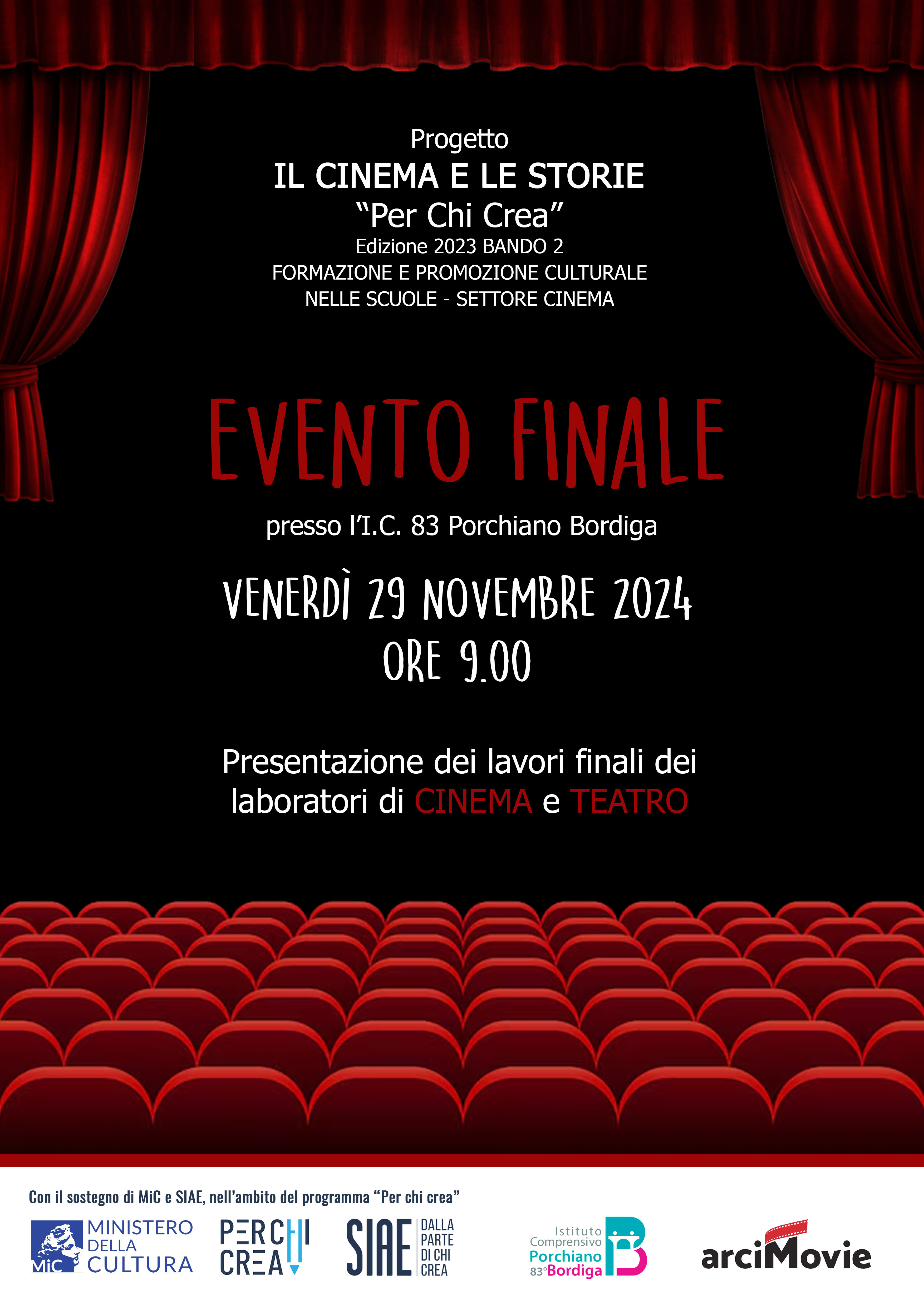 La manifestazione è organizzata nell'ambito del Progetto IL CINEMA E LE STORIE - “Per Chi Crea” Edizione 2023 BANDO 2 – FORMAZIONE E PROMOZIONE CULTURALE NELLE SCUOLE SETTORE CINEMA