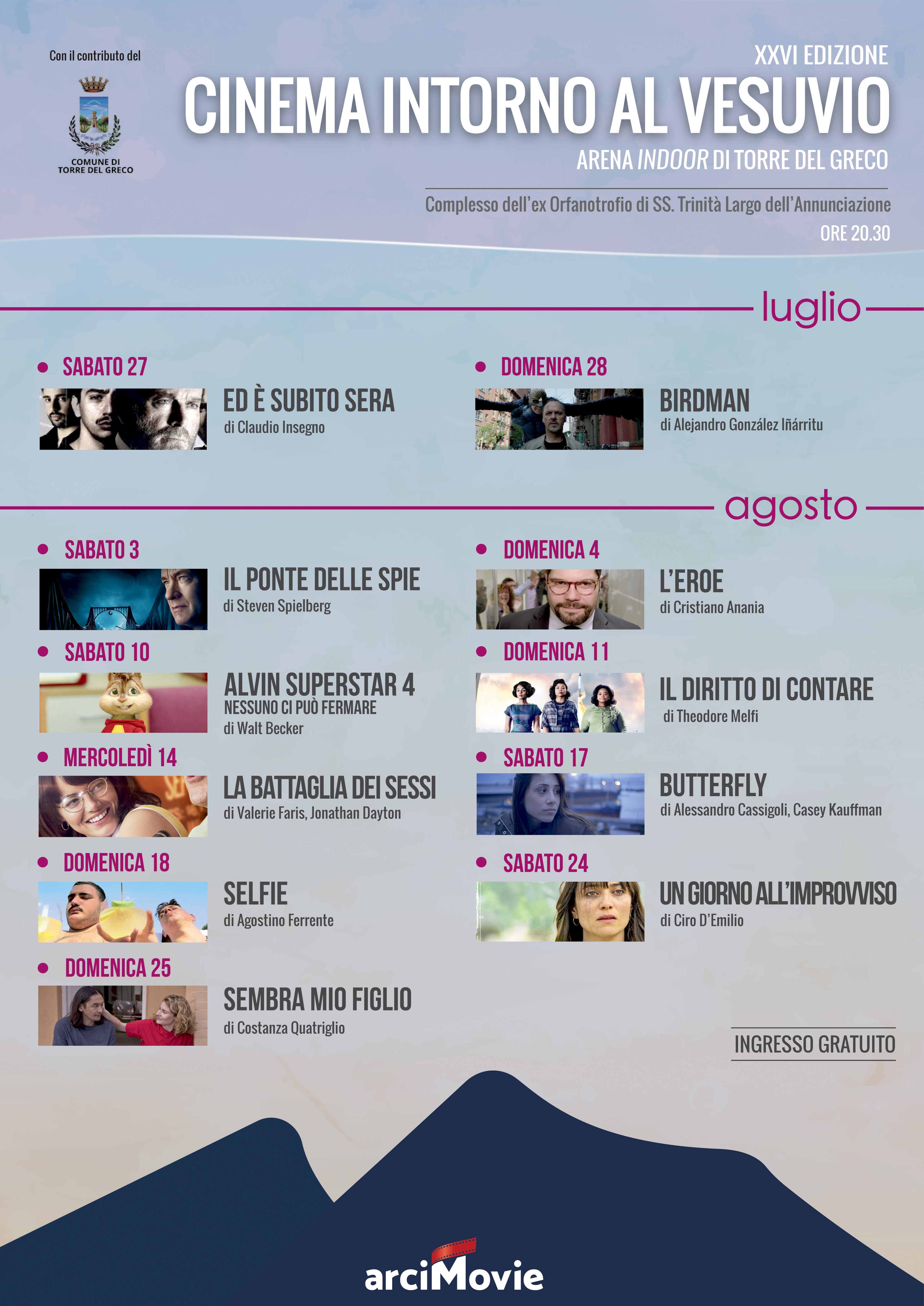 La storica rassegna Cinema intorno al Vesuvio torna a Torre del Greco con un'Arena di cinema INDOOR presso il Complesso dell’ex Orfanotrofio di SS. Trinità (Largo dell’Annunciazione, 14) con undici serate dal 27 luglio al 25 agosto 2019.