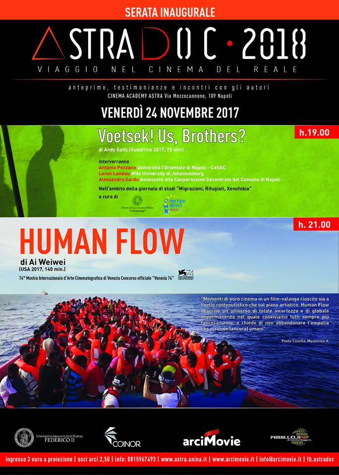 La proiezione di Voetsek! Us, Brothers? rientra nel programma della giornata di studi: Migrazioni, Rifugiati, Xenofobia a cura dell'Università degli Studi di Napoli "L'Orientale" e del CEICC- Europe Direct Napoli del Comune di Napoli.