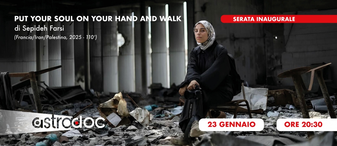 Torna per la sua sedicesima edizione la rassegna AstraDoc - Viaggio nel Cinema del Reale, a cura di Arci Movie con Parallelo 41Produzioni, Università degli Studi di Napoli Federico II e Coinor e con il patrocinio del Comune di Napoli. Il primo appuntamento è il 23 gennaio 2026 alle ore 20:30 presso iol Cinema Astra con "PUT YOUR SOUL ON YOUR HAND AND WALK" di Sepideh Farsi (Francia/Iran/Palestina, 2025, 110'). Presentato in anteprima mondiale al Festival di Cannes, nella sezione Acid, poi alla Festa del Cinema di Roma, è un'opera toccante che racconta con gli occhi e le parole di Fatma Hassouna la quotidianità di Gaza sotto le bombe. L'evento sarà accompagnato dall'intervento di Arturo Scotto (Deputato), Sara Borrillo (Prof.ssa Storia dei Paesi Islamici dell'Università l'Orientale) e Luigi Daniele (Prof. Diritto Internazionale dell'Università del Molise)